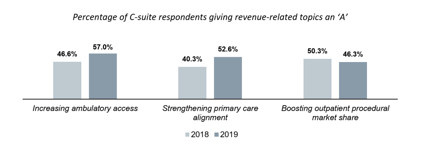 In contrast to previous periods of margin pressure, structural shifts within the industry—rather than temporary declines in the overall economy—are driving today's revenue challenges. As a result, hospitals and health systems are seeking new strategies for capturing revenue growth. "Increasing ambulatory access" and "strengthening primary care alignment" were among the highest-scoring topics on this year's survey; both topics also experienced a notable increase in interest relative to 2018. Interest in growing the outpatient procedural book of business remained steady. Overall, executives remain hyper-focused on ambulatory growth, with a particular interest in moving upstream and capturing revenue from access and primary-care focused strategies.