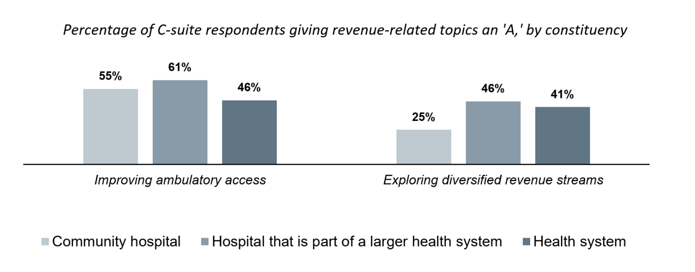 Different types of organizations are embracing different strategies for growing revenue. While all respondents expressed strong interest in improving ambulatory access, leaders from larger health system also indicate intentions to explore diversified revenue streams.