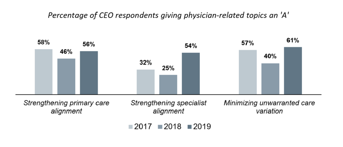 In 2018, when executives were laser-focused on cost control, executives' interest in physician-related topics dropped. This year, however, leaders are highlighting physicians' integral role in both revenue growth and cost control, and physician-related issues returned as a leading priority. Physician-related topics scored even higher among CEOs than other C-suite respondents, indicating a strong likelihood that hospitals and health systems will place more time and effort on physician partnership to advance margin goals. However, strengthening ties with physicians could be increasingly difficult for hospitals and health systems. Private equity firms, health plans, retailers, and technology companies are all vying with hospitals and health systems for physician talent and are fueling unprecedented competition in the market for physician partners.