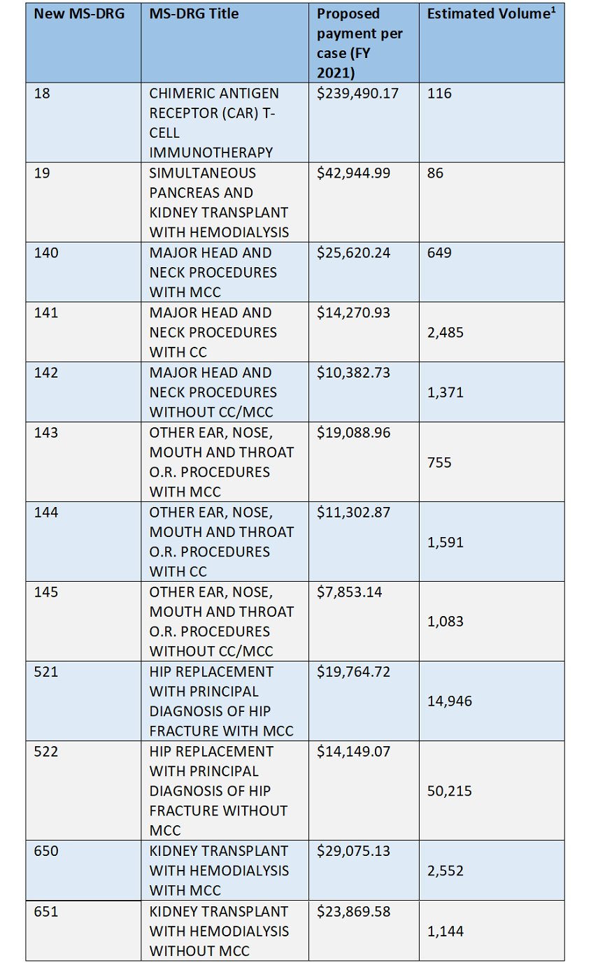 (1) Estimated volumes computed from FY 2019 MedPAR volumes grouped to CMS proposed v38.0 grouper for FY 2021.
