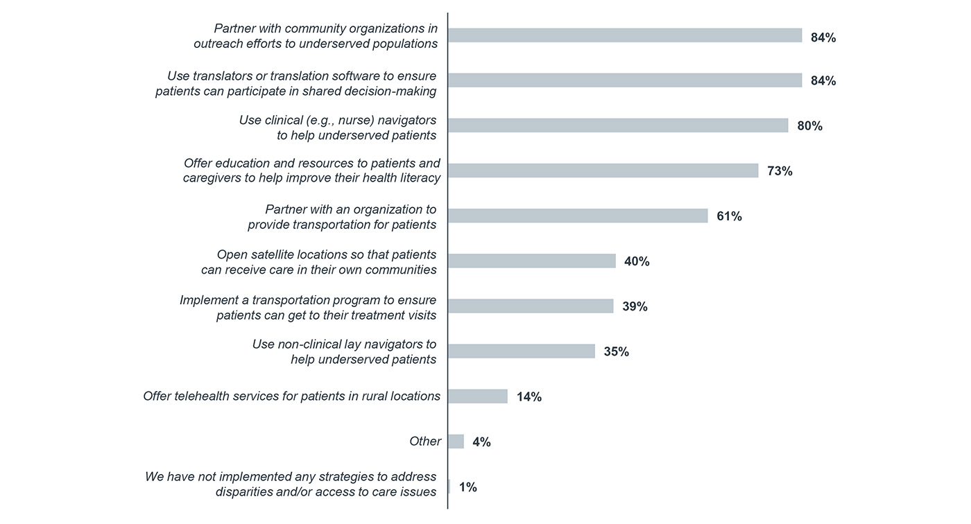 When analyzing the data by organization type, academic cancer centers were twice as likely to use a non-clinical lay navigator to help underserved patients (75%) than other respondents (35%). Independent physician practices were less likely to partner with community organizations (40%) compared to other respondents (84%). Across all cohorts, offering telehealth services for patients in rural locations was the least common strategy (14%) to address barriers to care. Check out our telehealth primer to learn how it can benefit your program and your patients.