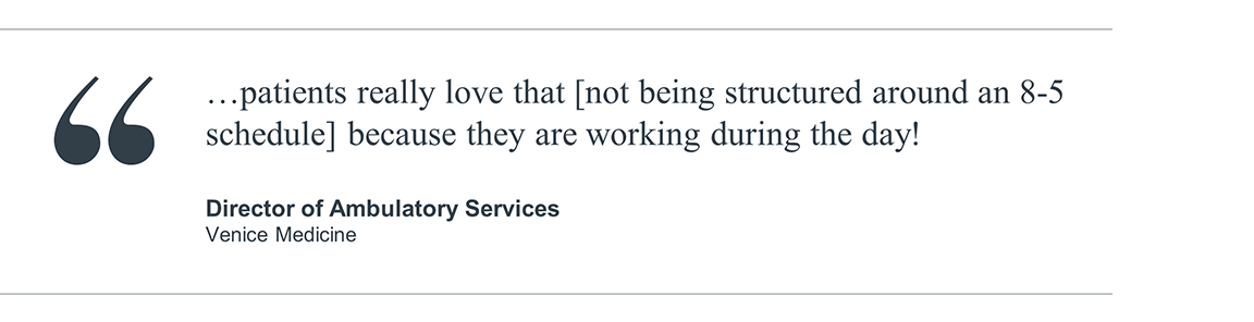 Although flexible scheduling began as a way to maintain physician satisfaction, patients have benefited from extended hours as well. Patients are drawn to Venice from the competitive areas surrounding their outreach centers, given Venice’s reputation for quality and compassionate care. Flexible hours is a further way to draw patients in and keep them happy. One challenge that Venice still grapples with is communicating to patients that this flexibility exists.