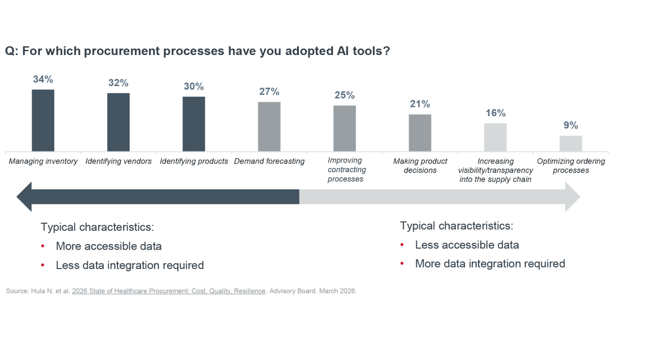 Health systems are approaching AI adoption in procurement cautiously, focusing first on low‑risk, high‑value use case over broad transformation. Early applications include inventory management and product or vendor identification that rely on accessible data and limit operational risk. This measured approach allows organizations to build confidence, strengthen data foundations, and demonstrate value before expanding AI’s role in more complex purchasing decisions.