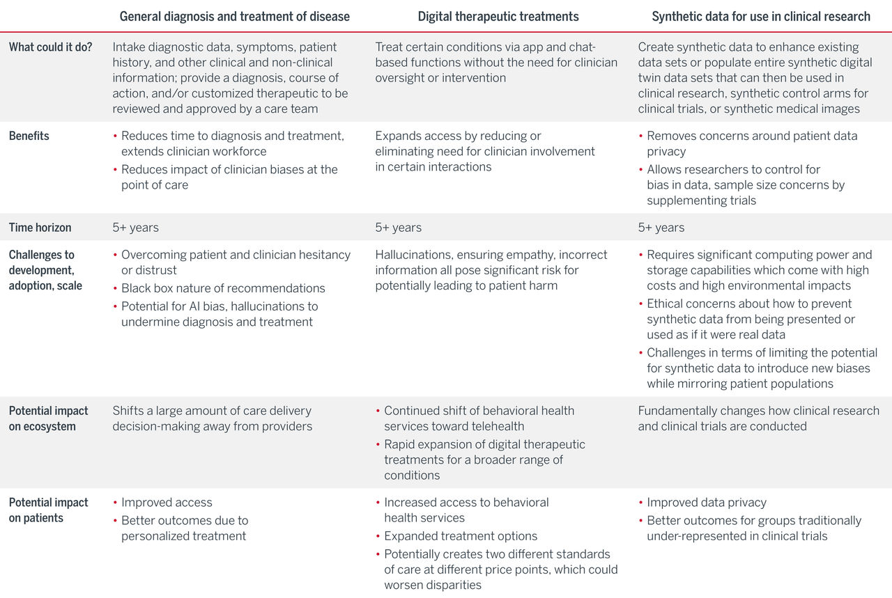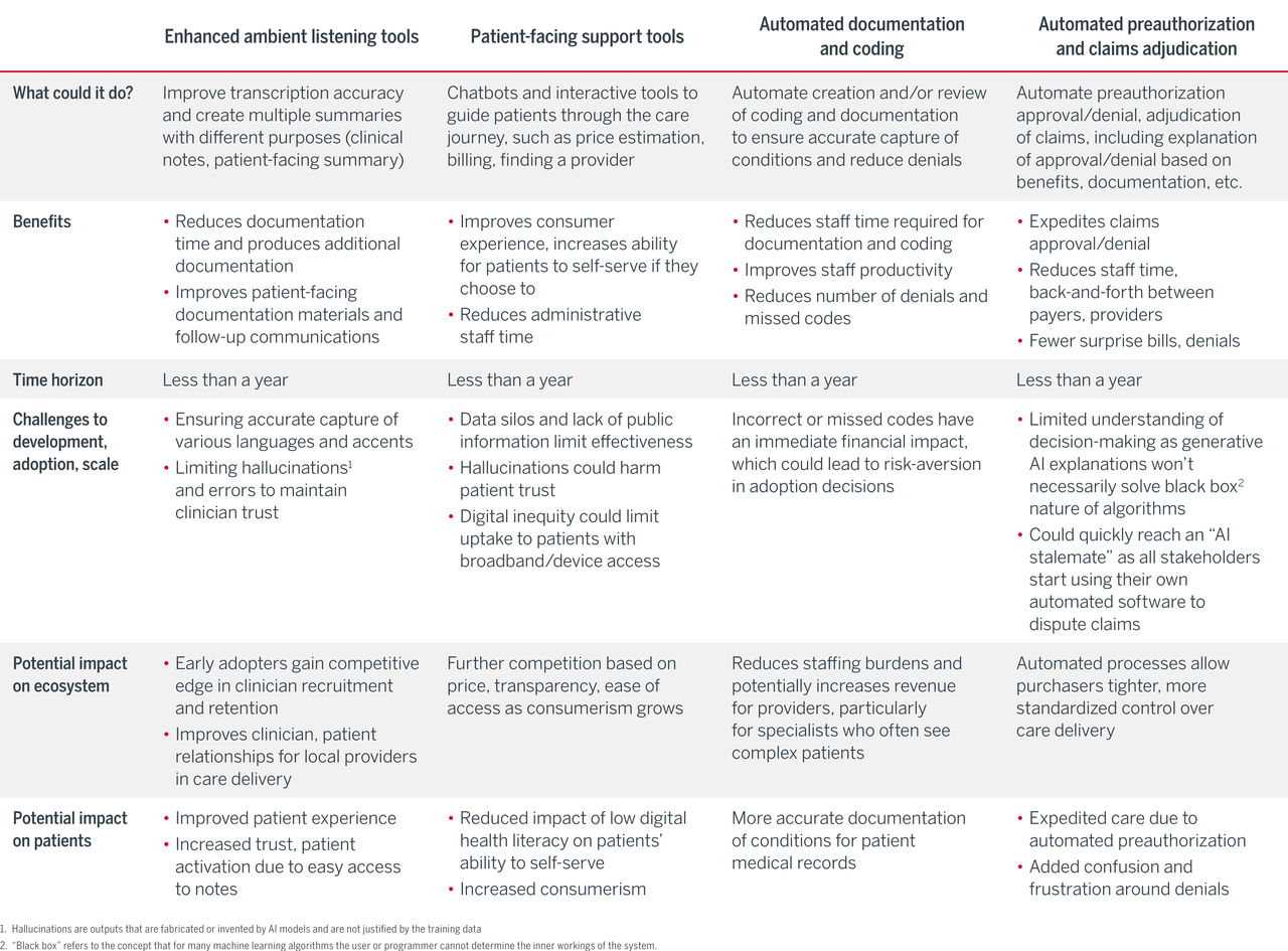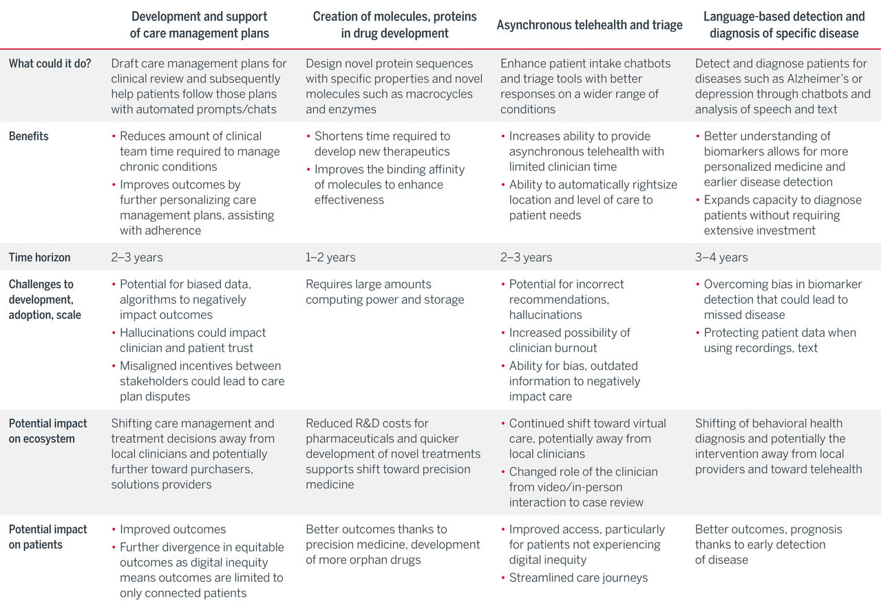 Continue LogoutThis field guide details examples of potential use cases of generative AI in healthcare. It is neither comprehensive nor prescriptive. For the examples listed, we recommend considering how this would impact your organization directly, how it might change your organization's role in the broader ecosystem, and how it might impact any future partners or competitors.