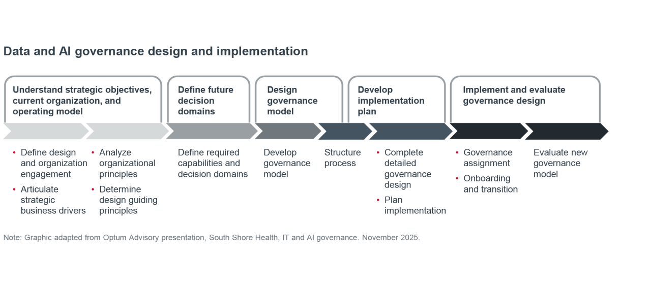 AI governance becomes a strategic advantage when implemented well and adapted over time. Strong governance creates consistent pathways for evaluating, approving, and monitoring AI tools. Today, that consistency is essential as models are updated more frequently, more vendors offering AI enter the market, and clinical teams leveraging AI outputs to a greater extent. Robust and disciplined governance reduces uncertainty and is necessary for promising initiatives to sustainably scale across the enterprise.