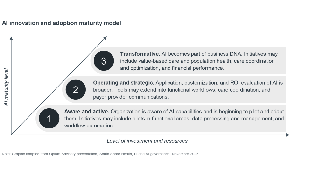 At the most advanced levels, AI is embedded into the organization’s operating model and is integral to care coordination, operational optimization, and financial planning.