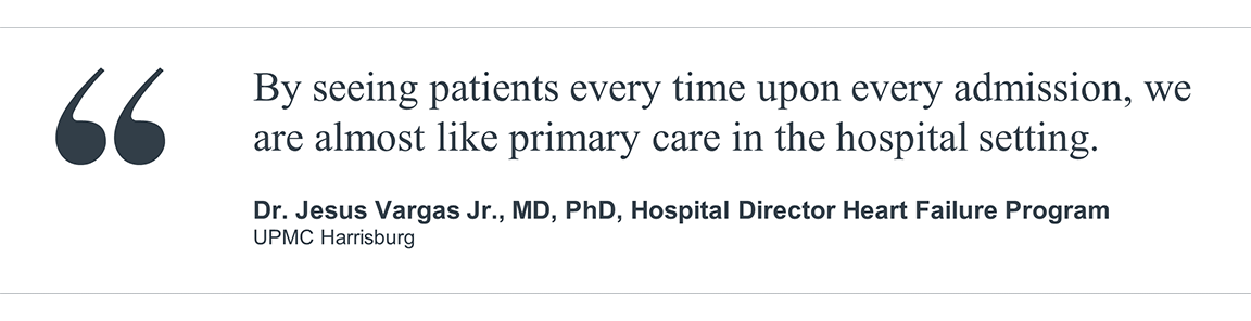 UPMC Harrisburg hospital developed a dedicated Congestive Heart Failure (CHF) hospitalist team to follow HF class 1 guideline-directed medical therapies in a high-touch care model. The team also focuses on patient and family education to improve treatment plan adherence and created structures for continued patient engagement outside of the original inpatient visit.