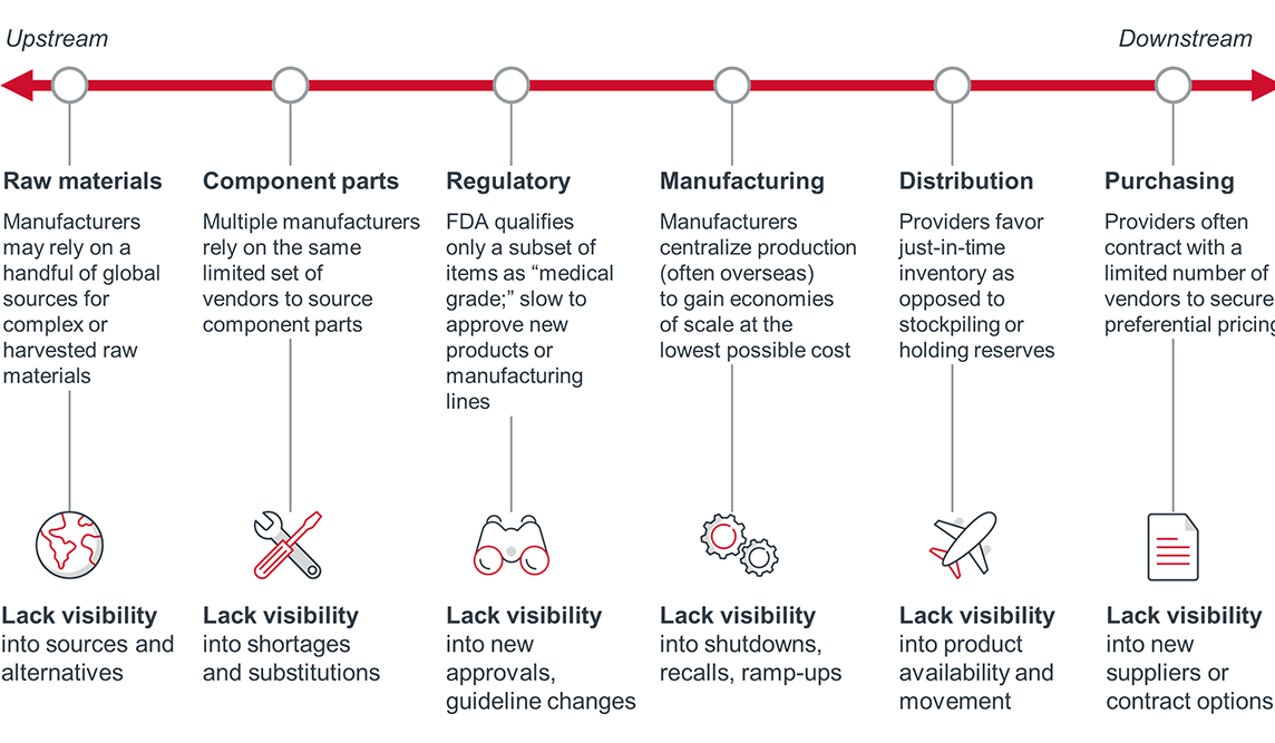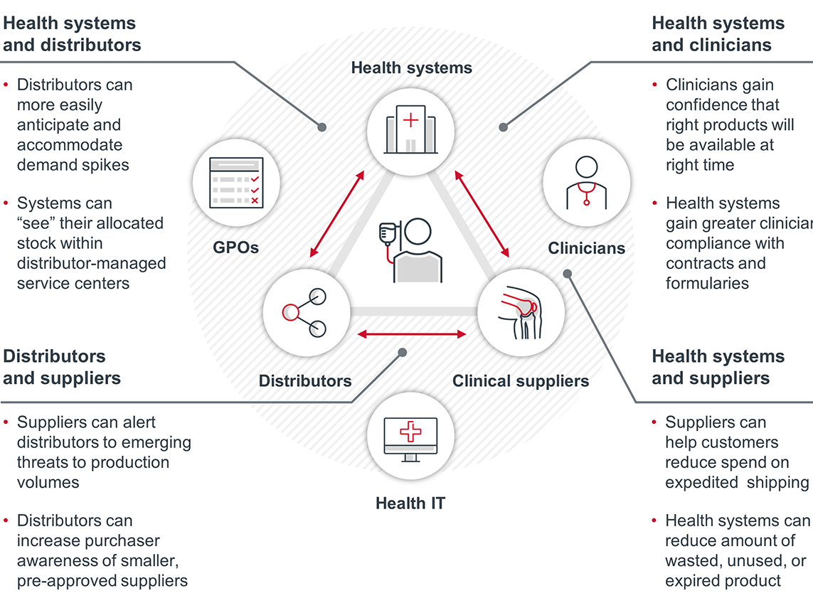 This crisis has exposed an acute need for leaders across the health care supply chain – from manufacturers to distributors to provider organizations (purchasers) – to re-evaluate legacy strategies that have prioritized efficiency over resiliency. For a more sustainable, reliable supply chain to emerge, all parties must seek opportunities to increase transparency, enhance flexibility, and facilitate greater collaboration.