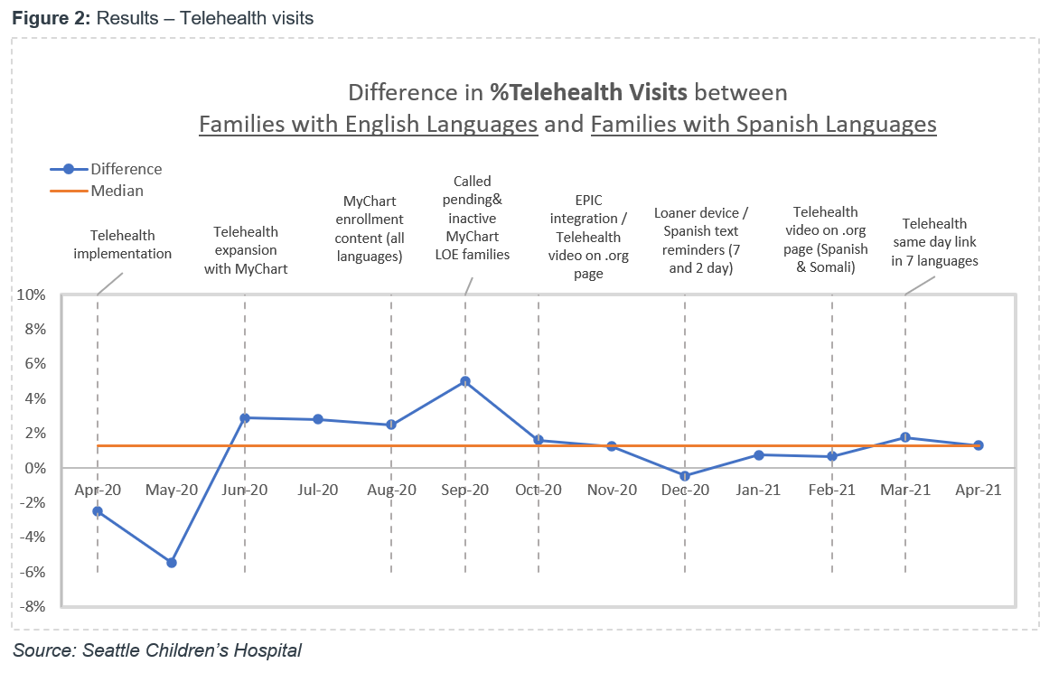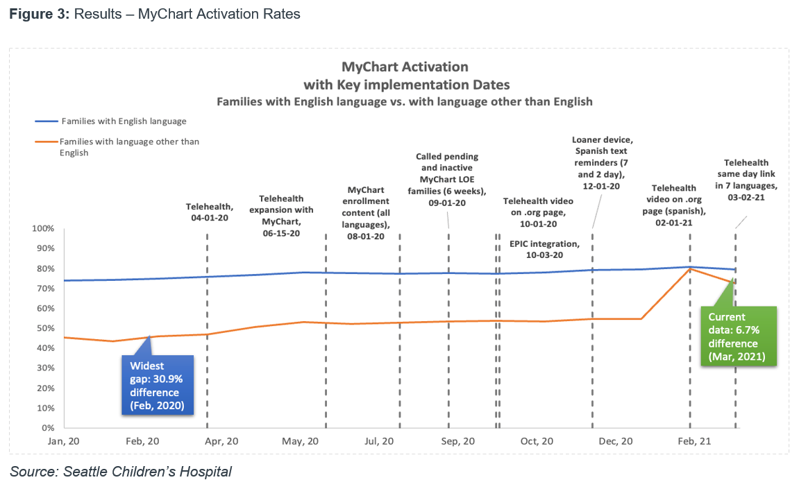 The concentrated efforts to address digital inequities helped Seattle Children’s Hospital reduce the gap in telehealth use and the variance in MyChart activation rates among different demographic groups. The team also learned valuable lessons in how to increase technology adoption among all types of patients.