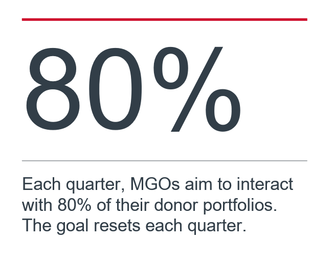 To help MGOs prioritize prospects, leaders created a primary portfolio—smaller than their previous portfolio—and a secondary portfolio. Primary portfolios consist of <75 prospects and secondary portfolios consist of <100 individuals. MGOs are assessed based on their performance within only their primary portfolio.