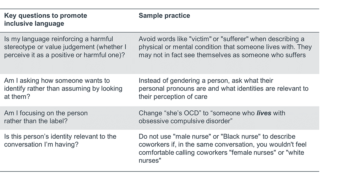 Once you have embedded these micro-shifts into the day-to-day work experience, the next step is to focus on a more comprehensive approach to using inclusive language. For example, review the language used in your organization’s employee handbooks, posters, internal newsletters, and patient education materials. Remember, inclusive language is not just about memorizing the right words but also accepting peoples’ differences and letting them define their own identity.