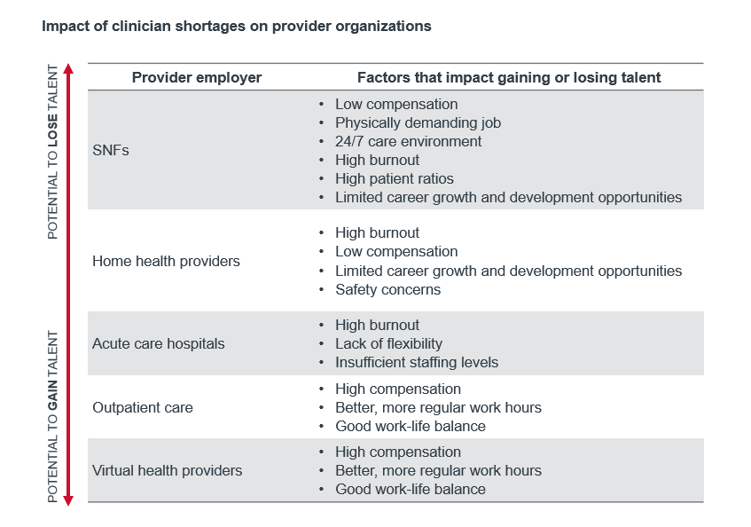 It’s a complex situation: attracting workers away from healthcare organizations in one setting will result in staffing difficulties in another. For example, if a SNF experiencing staffing shortages is unable to accept transfers from a hospital, that hospital is left full of patients who cannot be discharged to subacute care. See the table below for more details on the impact of clinician shortages on provider organizations.
