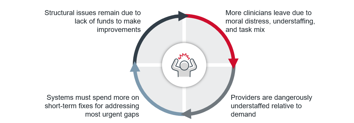 Clinician turnover often creates a vicious cycle. Staff leave due to their working environment, which puts an enormous strain on the workers who are left behind. Those left behind then leave due to the working environment, restarting the cycle. This cycle leaves facilities understaffed and forced to rely on short-term fixes like travel nursing expenditures to fill in the gaps. These short-term fixes are expensive and leave no money to invest in underlying workforce issues, further perpetuating cycle shown below.