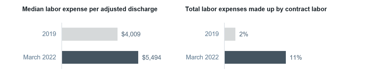 The healthcare industry is dominated by increasing costs and tightening margins. Even before the pandemic, labor costs typically made up more than 50% of hospitals' total expenses. Staffing shortages and an increased reliance on contract labor have caused labor expenses to jump sharply. Labor expenses per adjusted discharge increased by more than one-third from pre-pandemic levels through March 2022, while contract labor as a percentage of total labor expenses increased more than five times the rate from pre-pandemic levels.