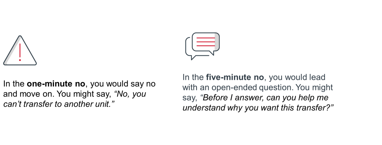 From the very start, the “five-minute no” has a very different tone. For example, take a situation where a staff member requests to transfer to another unit.