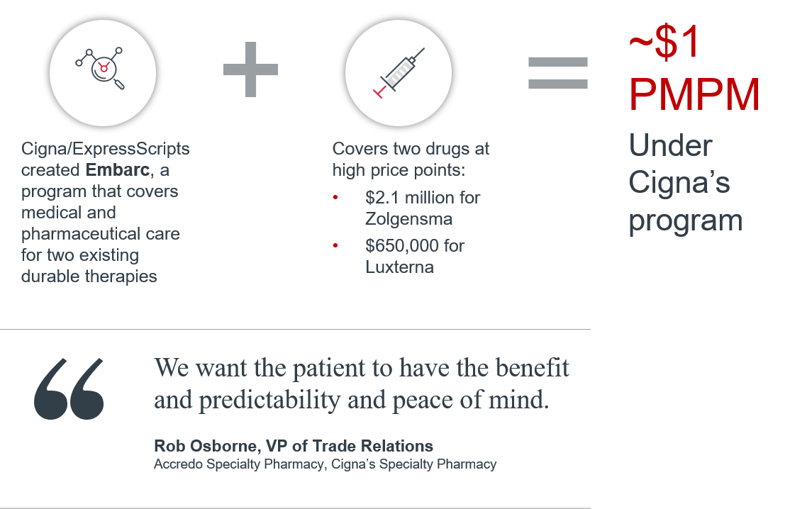 Introduced by Cigna in September of 2019, Embarc is designed to coordinate the drug procurement and care management required for two specific drugs: Zolgensma and Luxterna. Organizations that subscribe to the service pay a PMPM fee for the gene therapy network, and all out-of-pocket expenses for patients are waived as part of the agreement. Pharmacies and other sites of care are paid for the drugs through Embarc as well.