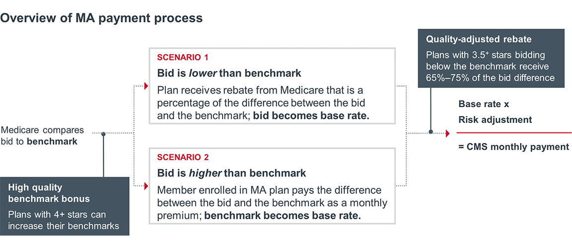 The Centers for Medicare and Medicaid Services (CMS) provides a cost per enrollee (base rate) to private health plans through a bidding process. Payers can submit a bid based on estimated cost per enrollee. These bids are then evaluated against a benchmark. Benchmarks vary by county, as each county is comprised of people with different health care needs and health status.