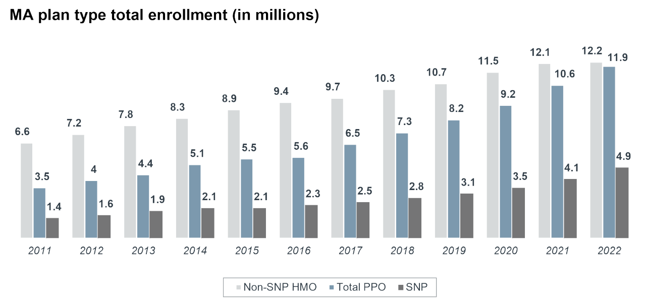 It's important to note that the majority of seniors in MA are still in HMOs, despite the more robust growth rates of PPO products. A significant driver of growth in HMO enrollment in 2022 is the accelerating popularity of SNPs, which grew by 20% between 2021 and 2022 alone.