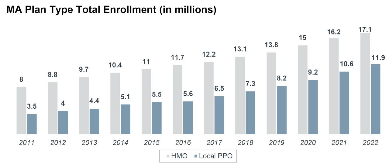 Recent growth in MA enrollment has been higher among local PPOs than other plan types, with a 12% growth in enrollment from 2021 to 2022. Local PPOs tend to be easier to sell than other product types because they appeal to consumers who want more open networks of providers (compared to HMOs), while rising MA rebates have enabled health plans to offer even more generous benefits in their local PPOs.