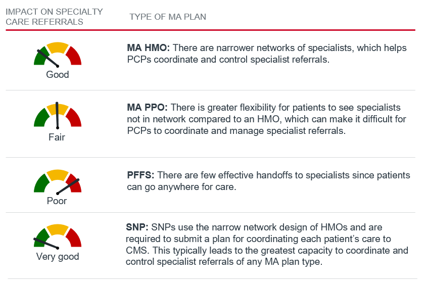 The MA plan type can impact the cost and coordination of specialty care referrals. Health plans can use a variety of different methods like network design, provider directories, specialist financial incentives, online patient portals, and risk sharing with their primary care physician (PCP) partners to help shape higher-value referral patterns to specialists. These methods aim to reduce unnecessary referrals, out-of-network referrals, and low-value referrals, which contribute to the high and growing costs of specialty care.