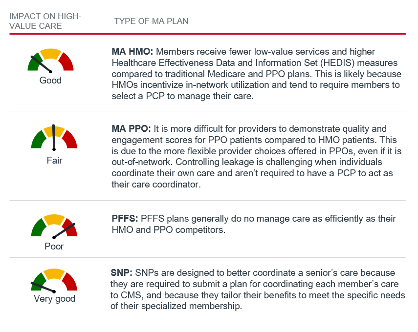The senior population is a diverse group of individuals with varying degrees of medical complexity. Therefore, health plans have created a range of MA plan types to better meet these varying needs. Although seniors have the freedom to choose between plan types, some MA plan types are more financially and clinically effective at meeting the needs of seniors than others based on a variety of factors which include: