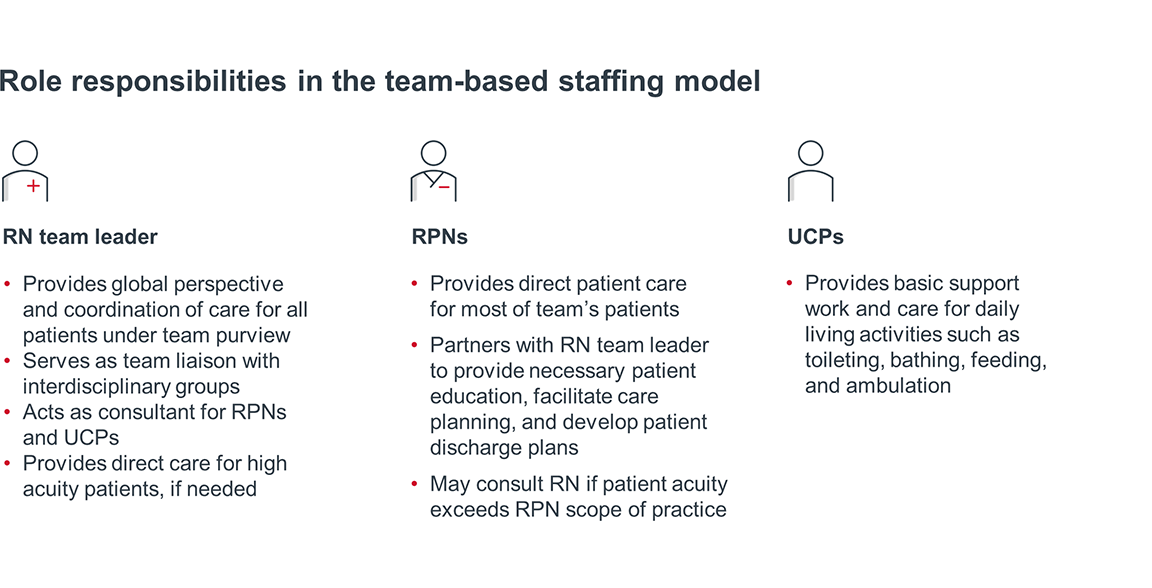 Lastly, two pilot units implemented the new staffing model before leaders introduced it across the organization. The general model across all units includes an RN team leader, RPNs who provide care, and UCPs who provide coordinated support.