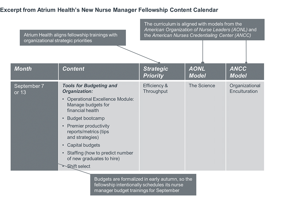 Use a residency-style training program to supplement the on-the-job experiences of new nurse managers. Blended learning, both experiential and classroom, is designed to anticipate and reflect annual management processes (ex. budget season).