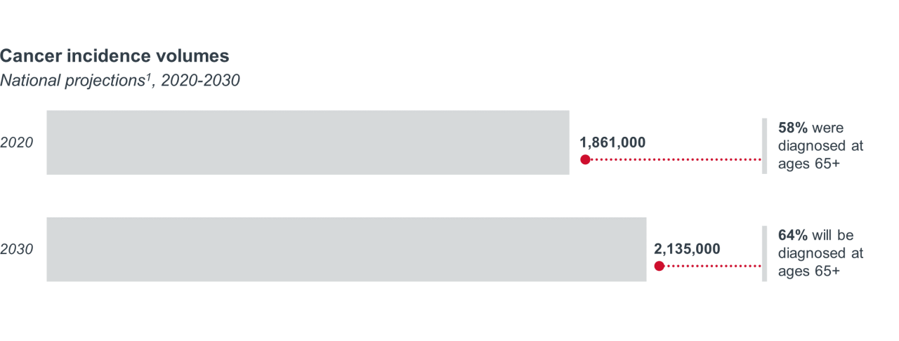 1Volume projections come from Mariotto AB, et al., while proportions of patients diagnosed at age 65 and older come from Advisory Board’s Cancer Incidence Estimator.