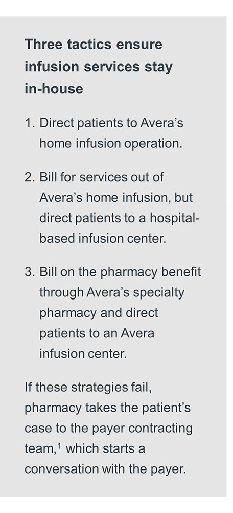 Avera Health’s pharmacy leader took a multipronged approach to streamlining site-of-care decision-making. She collaborated with critical health system leaders on understanding the options for ensuring that the right site-of-care decisions can be made in the moment. The leaders were then able to coordinate the right support for the teams responsible for making infusion decisions.