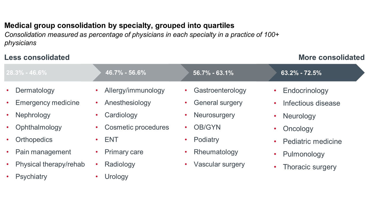 As mentioned earlier, some specialties are more or less consolidated than others. We analyzed a national data set from CMS to quantify consolidation for key outpatient specialties relative to one another. While this data offers a national snapshot, consolidation will vary by market, as the drivers mentioned earlier manifest differently in different localities.