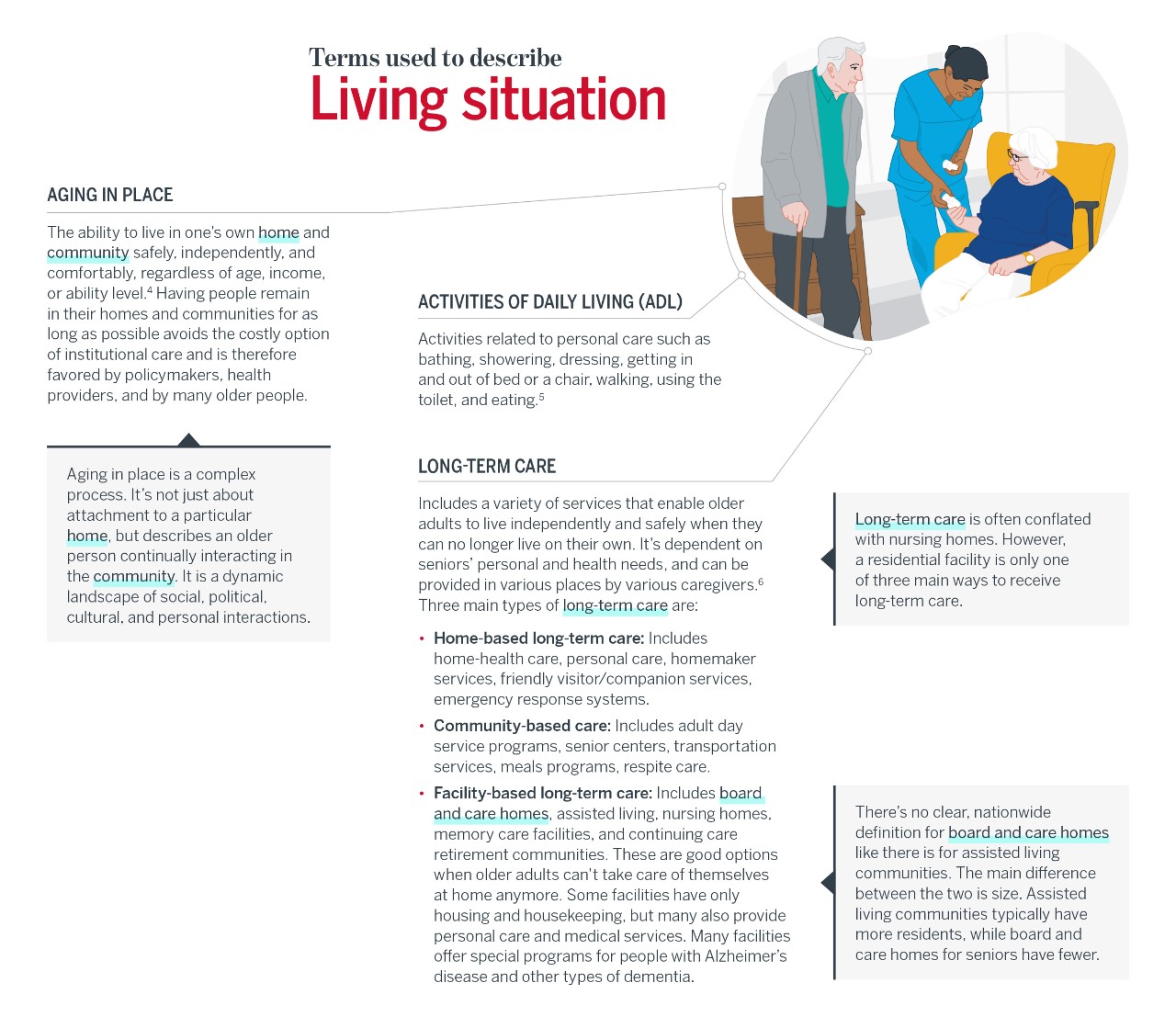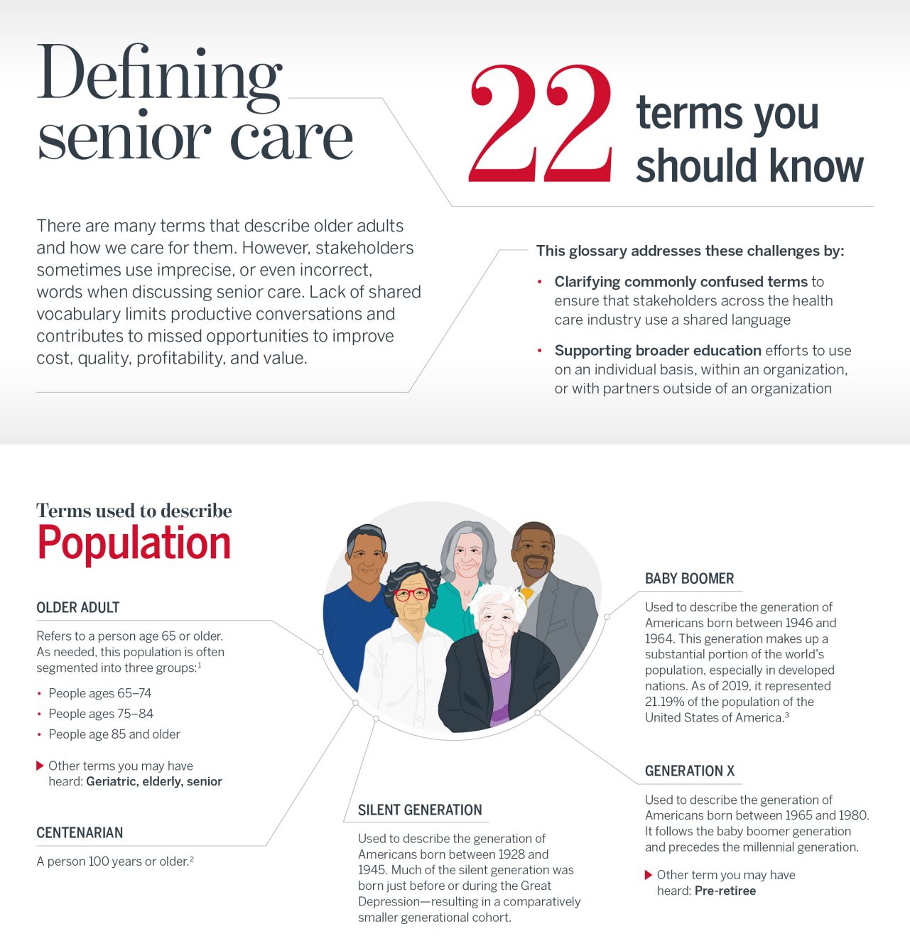 Continue LogoutThere are many terms used to describe seniors and how we care for them. But most stakeholders often use imprecise, or incorrect, terms when discussing senior care. Use this infographic to learn the terms that stakeholders most often confuse or use differently, as well as terms that are essential to understanding current trends.