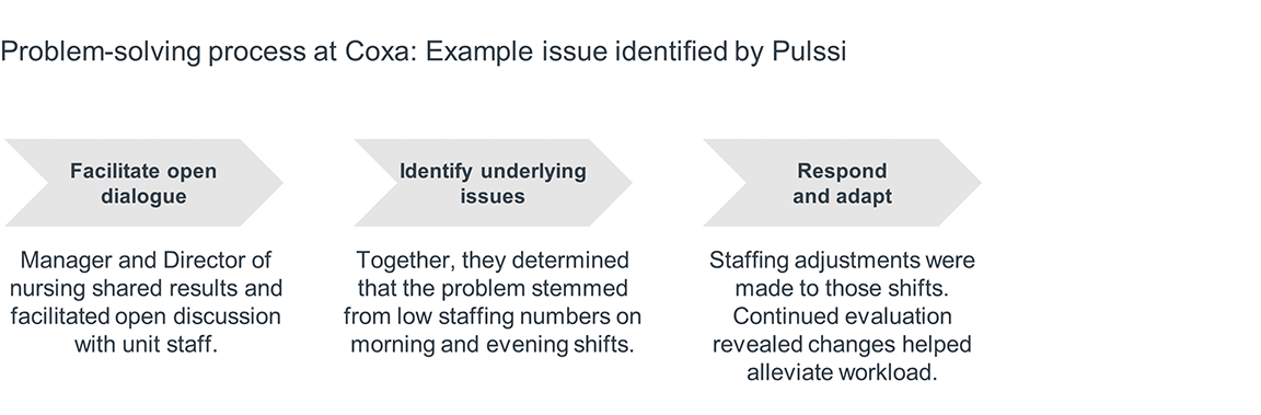Collection of Pulssi data drew leaders’ attention to problems as soon as staff identified them. By quickly bringing staff and leaders together to respond to the challenge, Coxa ensures that isolated issues do not escalate into larger problems over time.