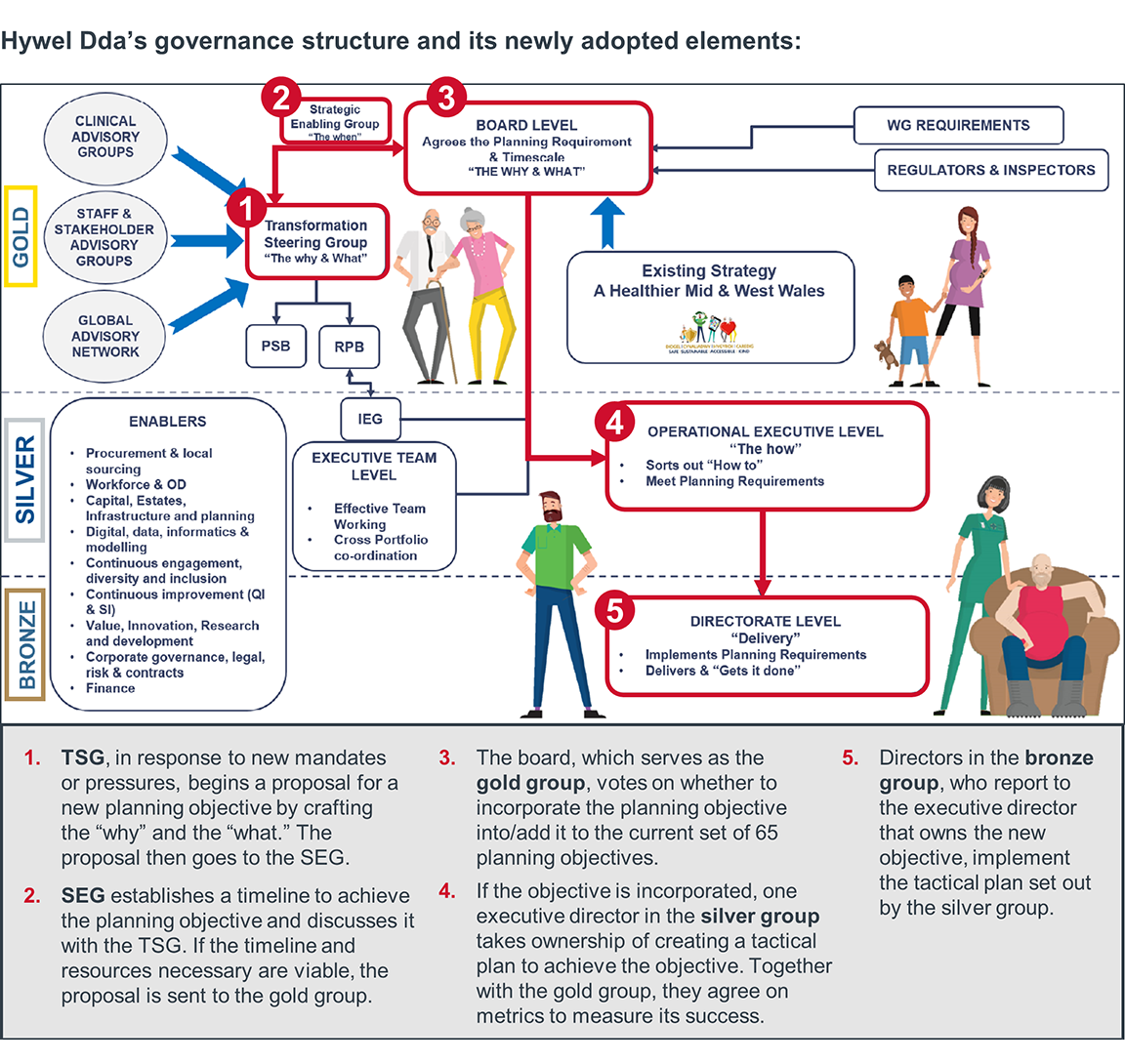 Hywel Dda uses a medal nomenclature to describe which parts of the organization have which responsibilities. The gold group (the board and chief executive) ensures the system progressively moves toward their six strategic objectives. They decide if a new planning objective proposal is in service of those six strategic objectives, and thus worth pursuing or not. Once ratified, the gold group passes the new planning objective onto the silver group (executive directors) to create plans to achieve each planning objective. The bronze group (unit/divisional directors) implement these plans and see them through to completion.