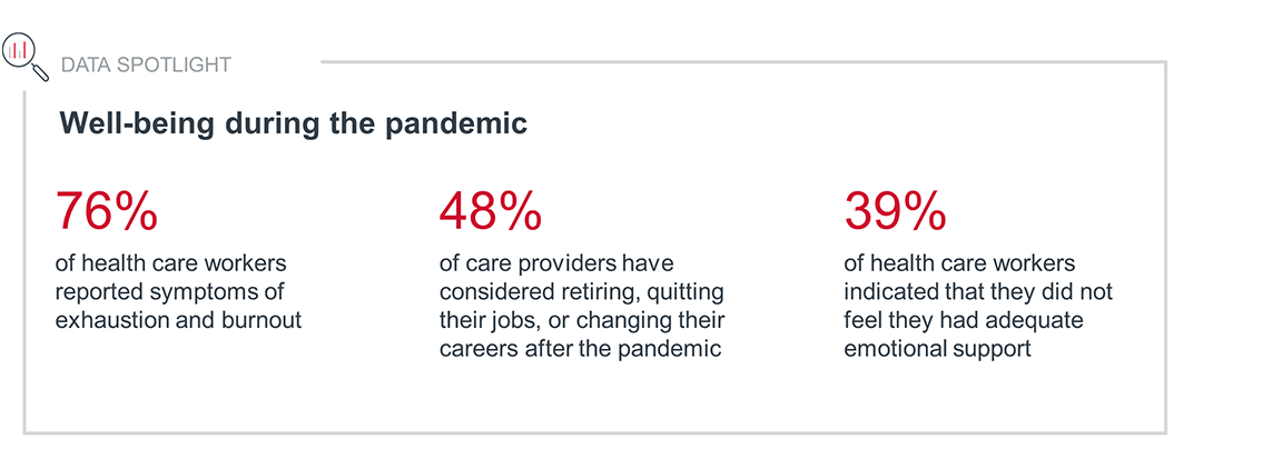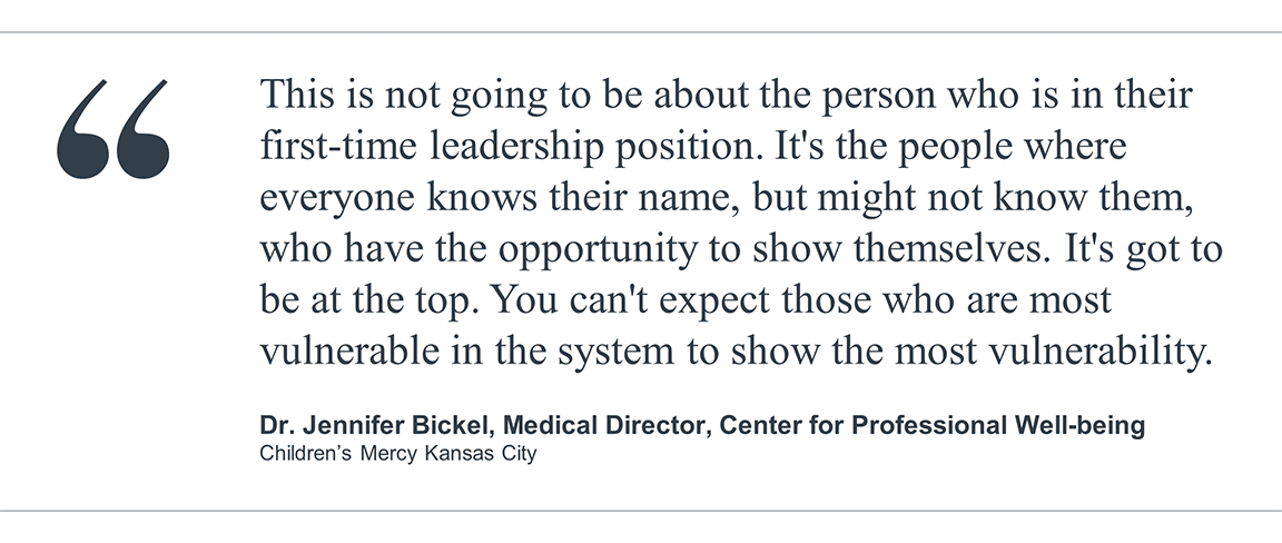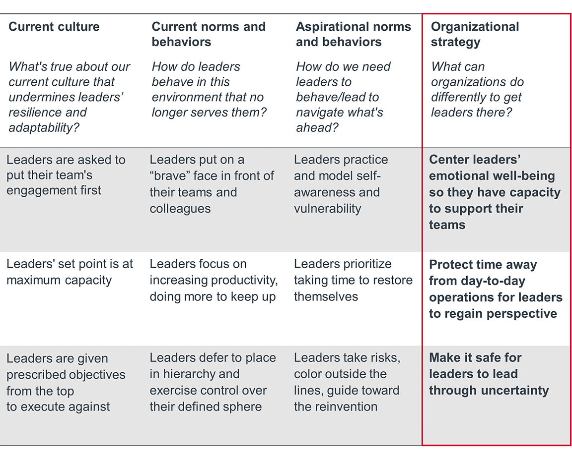 Covid-19 illuminated the fact that the current way we are asking our health care leaders to operate is not sustainable. While they have demonstrated tremendous resilience in response to the pandemic, many are experiencing burnout or leaving health care altogether. Moreover, leaders must continue to operate in an increasingly uncertain and volatile environment well beyond the end of the pandemic. This reality requires adaptive leaders who practice and model self-awareness and vulnerability, prioritize taking time away to restore themselves, and take risks to lead their teams through uncertainty.