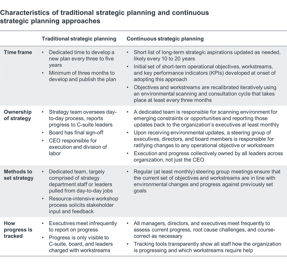 Continuous strategic planning is the process of continuously recalibrating organizational strategy in response to emerging constraints and opportunities. It can differ from the traditional strategic planning approach in a variety of ways.