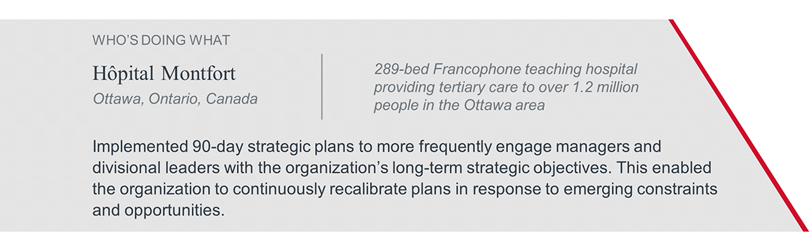 Hôpital Montfort’s 90-day plans break down long-term strategic objectives into actionable, measurable, and iterative short-term goals. Because of the short-term time frame, the plans are inherently flexible. At the end of each cycle is a recalibration forum where leaders discuss progress and reassess priorities. Leaders identify key gaps to focus on for the ensuing 90 days, incorporating changes in market dynamics or new Ministry of Health mandates into their thinking. At the end of each meeting, every manager updates their 90-day plans with a fresh set of goals and metrics to focus on.