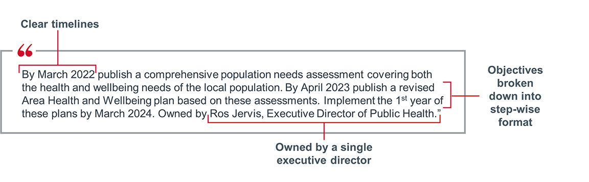 The six strategic objectives are purposely written as aspirations that describe the system’s long-term identity, meaning each one should still be true in a year or in a decade. Examples of the six objectives include “putting people at the heart of everything we do” and “the best health and well-being for our individuals, families, and our communities.” They are values as much as they are goals.