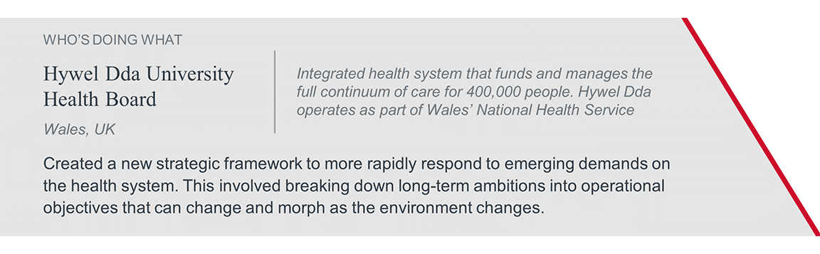 Hywel Dda’s executive team saw the risk in creating lofty, long-term ambitions without the organizational flexibility to change how to achieve them. With this new approach, the organization can routinely update, add, or retire any planning objective depending on changes in the environment. Essentially, this means that priorities and workstreams are expected to change over time as the leadership team and board collect new information.