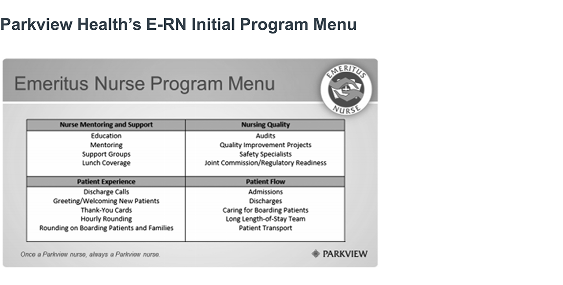 The goal of Parkview’s E-RN program was to create a new, less physically demanding role designed to attract and retain retired and near-retirement RNs. Parkview developed a series of guidelines to meet this objective.