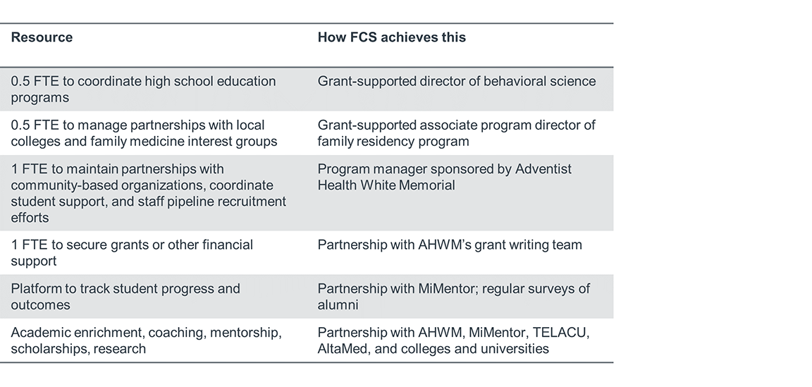 The table below offers an overview of the resources required to run FCS’ health professions pipeline activities. While not all of these resources are mandatory to start a similar model, these resources should be seen as goals for sustaining a similar approach.