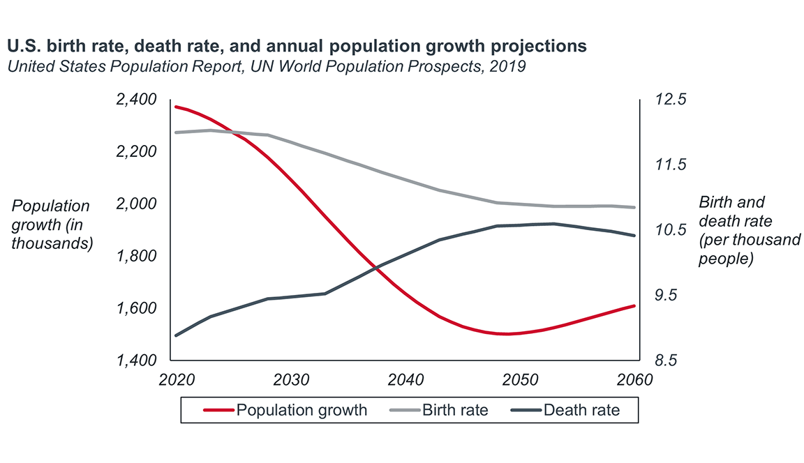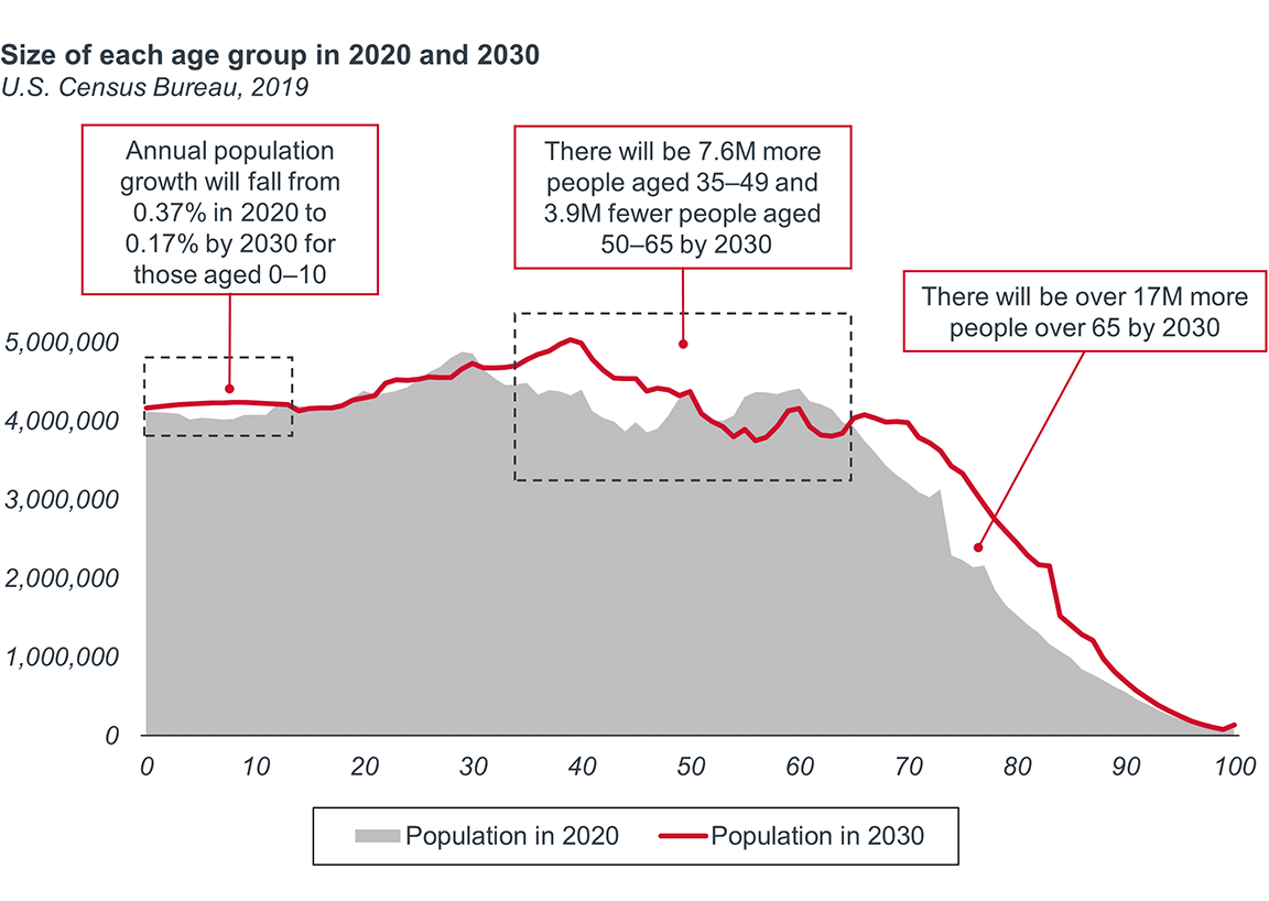 The U.S. population is expected to grow from 333 million today to 355 million people by 2030. Across this period, there will be three major population trends with implications for long-term health care utilization and planning. First, the U.S. population will become older, adding nearly 20 million baby boomers to the Medicare rolls. Second, there will be a dip in middle-aged people due to Generation X being smaller in size compared to the baby boomers it follows and the millennials it precedes. Third, there will be continued slowing of population growth as millennials opt for fewer children and birth rates continue to fall.
