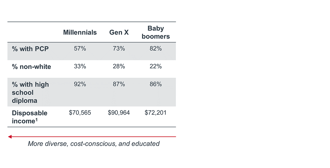 Millennials are already showing signs of following the same, if not worsened, chronic condition trend. But younger generations have an additional challenge—willingness to engage with providers to manage their care. Only 57% of millennials have a regular primary care provider (PCP) today.