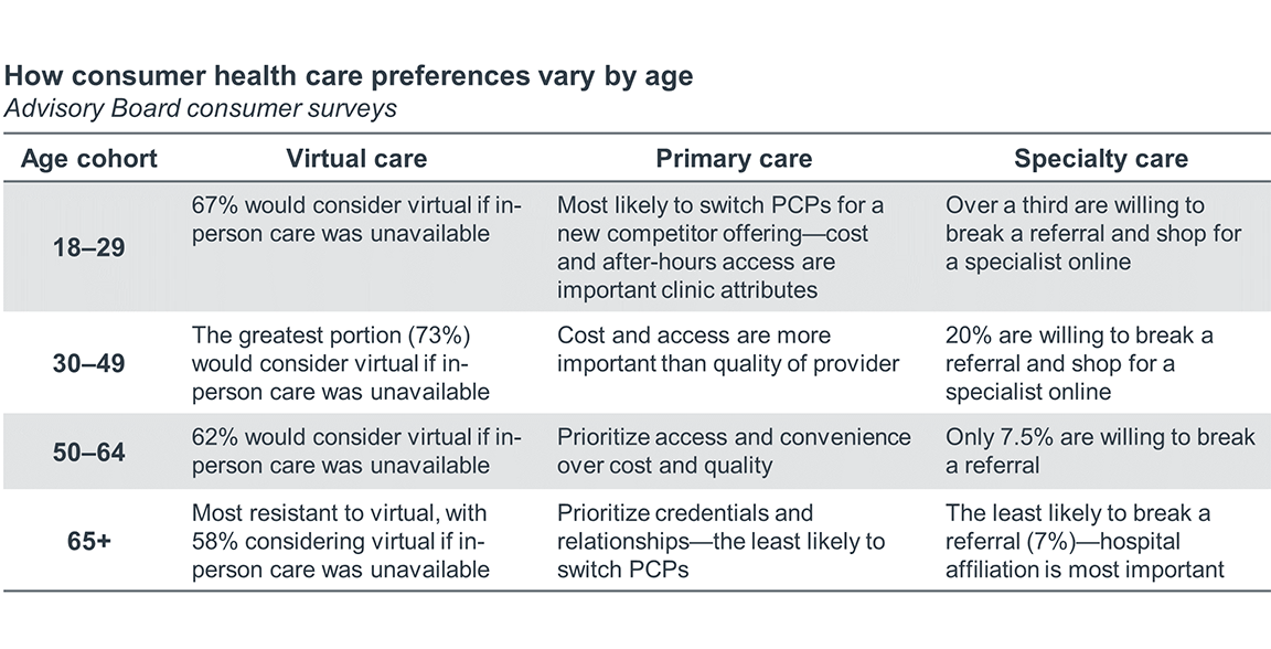 In addition, the diversity, price sensitivity, and education status of younger generations complicate matters. Younger generations are more likely to use nontraditional sites as their preferred providers, the least likely to exhibit loyalty toward a regular PCP, and the most likely to break a specialist referral.