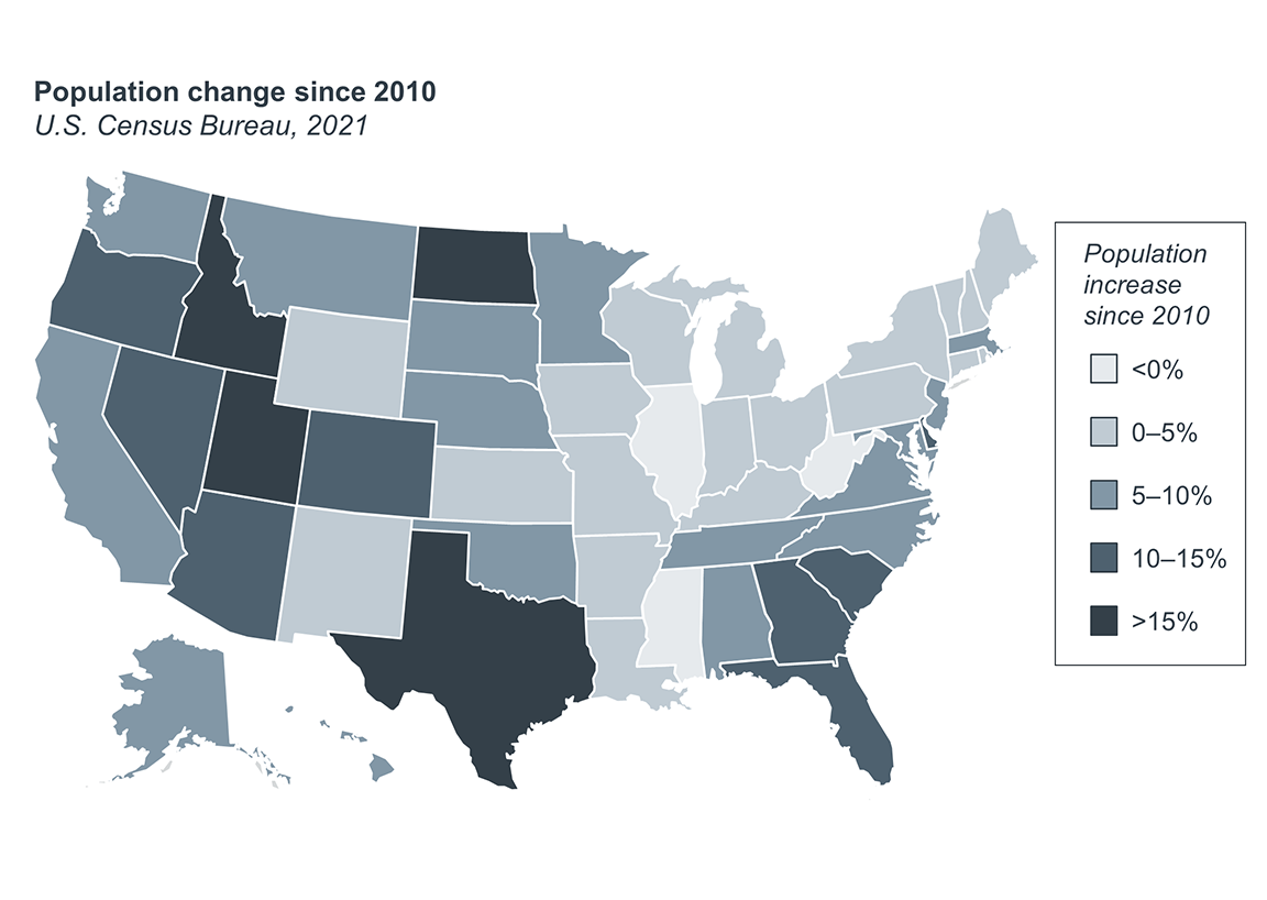 In many regions of the United States, meaningful population growth will be achieved only with extensive migration between states and immigration from abroad. And these numbers varied tremendously in the 2020 census. Nearly half of U.S. immigrants (44.9%) live in one of three states—California, Texas, and Florida—all of which saw the most total growth in their immigrant population since 2010. This helped the South and West experience significant population growth, of 9.6% and 8.9% respectively, throughout the decade. Conversely, the Midwest and Northeast have had less success attracting immigrants and domestic migrants, resulting in meager growth rates of just 2.1% and 1.2% respectively since 2010.