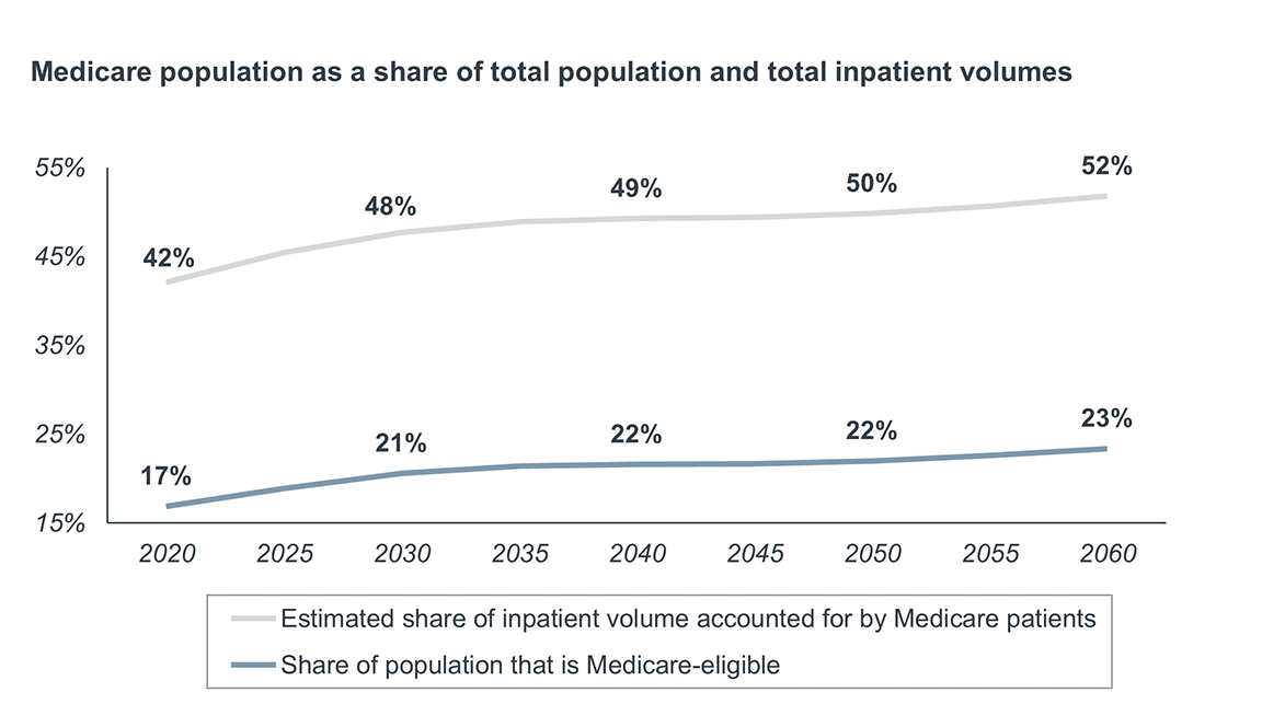 By 2060, the share of the U.S. population that is eligible for Medicare will increase from 17% to 23%. Over half of this increase will occur by 2030, with over 17 million baby boomers added to Medicare in the decade ahead. These consumers will account for a disproportionate percentage of care, particularly in the inpatient setting. By 2030, Medicare patients will account for nearly half of inpatient volumes.