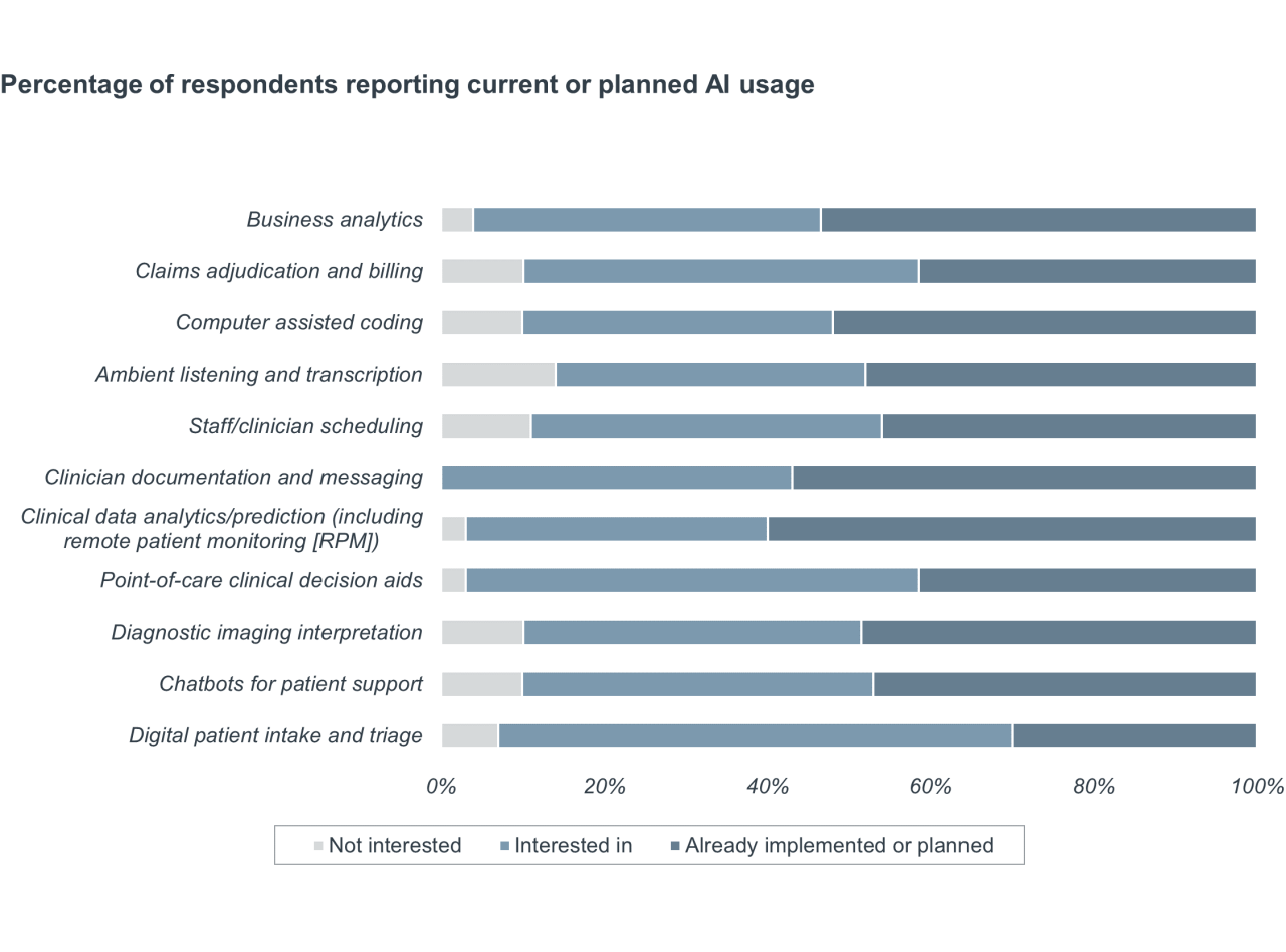 There were 37 total respondents. Common role descriptions of the respondents were: chief strategy officers, chief executive officers, and VPs and directors of strategy, planning, and/or business development. Respondents worked predominately at health systems.