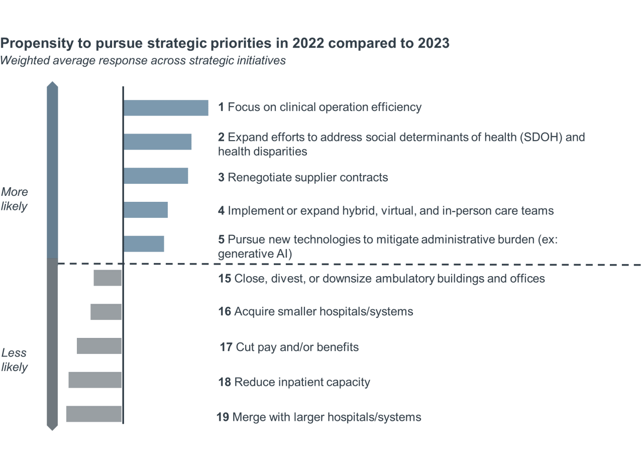 Continue LogoutAdvisory Board administered a survey on health system strategy from July to August 2023. The survey included Likert scale questions, ranking exercises, and true/false questions.