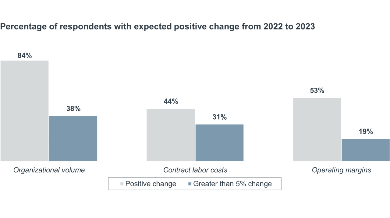 One important link to recovery of volume is FTE count. Systems that expect positive changes in FTEs overwhelmingly project positive changes in volume. But, on average, less than half of systems expected FTE growth in 2023. Meanwhile, high turnover, churn, and early retirement has contributed to poor care team communication and a growing experience-complexity gap. Prioritize rebuilding your workforce with these steps: