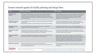 The Advisory Board Fellowship is designed to help facility planning and design leaders develop the skills needed to help their organizations, and those of their customers, navigate the complexity of the healthcare industry, solve emerging challenges, and advance organizational priorities. Across 18 months, participants engage in six intensives with emerging leaders from across the healthcare ecosystem including hospital, health system, and clinician executives. This is a unique opportunity for participants to not only learn more about their customers’ challenges but to work alongside them to develop critical leadership skills.